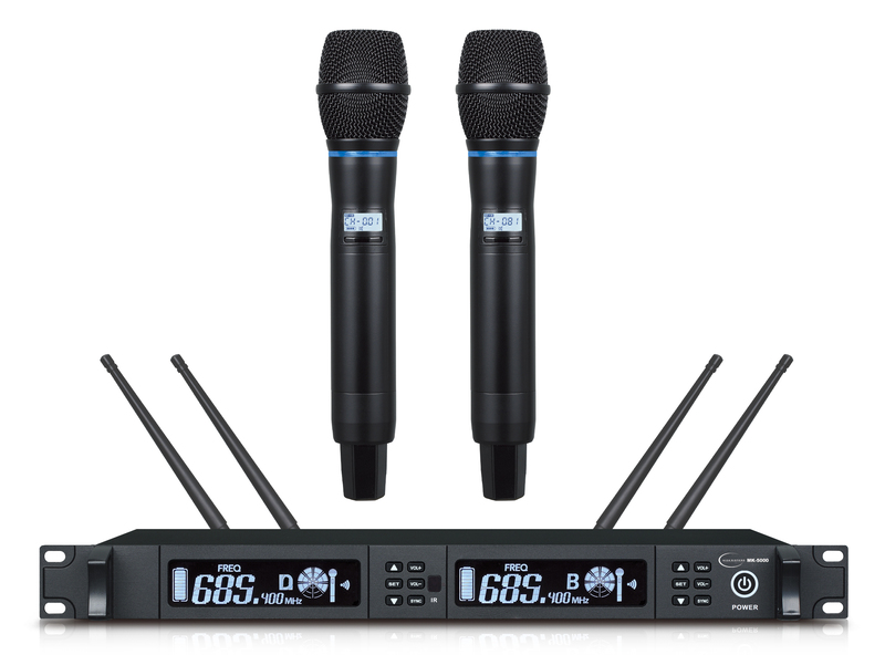 ◆ 本系统内任何一支话筒与任何一台接收机都可对上频,彻底解决了固定频率麦克风不通用的缺点,适合多套产品在同一场合使用;